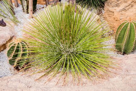 Blooming of different cactus with yucca in sunny day