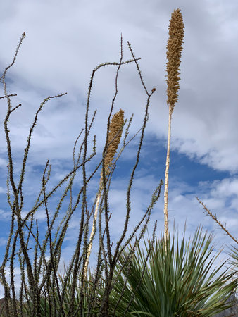Tropical desert plant with long brnahces and leaves for dry season environments in southern north american wilderness. Late afternoon sun with green texture and pattern on spiked shrubs.