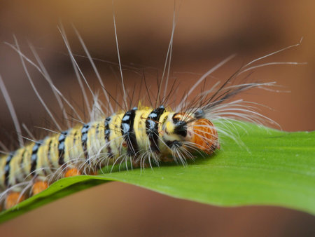 Colorful, hairy caterpillar crawls on a green leaf, showcasing nature up close in a lush garden setting. Its vivid colors stand out against the leaf backdrop, creating a beautiful scene outdoors.