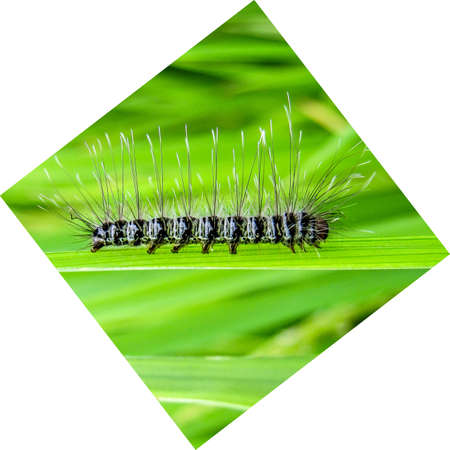 Diamond shaped image of a black and white caterpillar on a green leaf in the village.