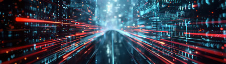Futuristic Abstract Cityscape with Data Stream Highway and Digital Network in Seamless Background
