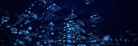 Future digital city concept. Blockchain technology. Abstract information network in global cyberspace. 3D illustration of data blocks in a cloud database. Computer binary code