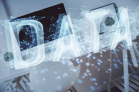 Data word hologram on empty room interior background, big data and blockchain concept. Multiexposure