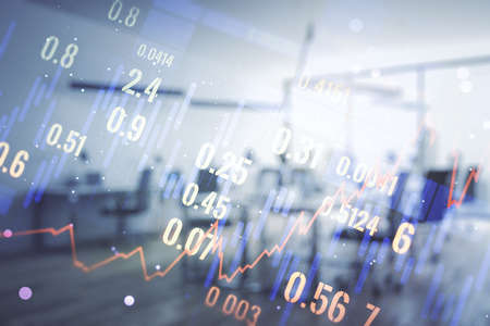 Multi exposure of virtual abstract financial diagram on a modern furnished office interior background, banking and accounting concept
