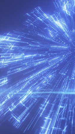 Abstract high-speed burst of glowing blue digital lines creating a tunnel effect.