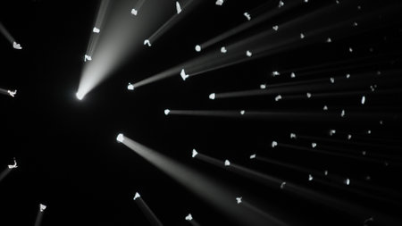 Close up shot of lights setup. Studio with black background, many dots white rays of light shine through the wall, spotlights and searchlights.