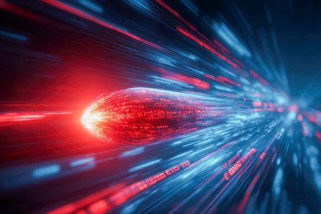 Vibrant red and blue streaks of light swirl rapidly across a sleek tech-inspired backdrop, evoking a sense of innovation, high-speed connectivity, and futuristic ene