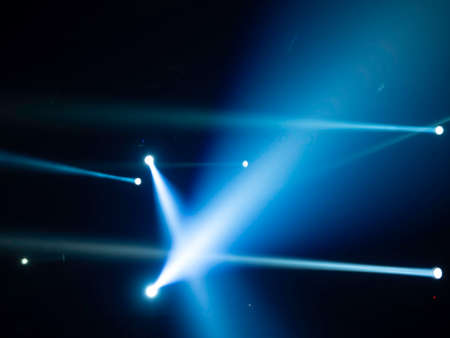 Blurred stage light concert background with blue color beam and laser rays on stage. Defocused entertainment show lighting.