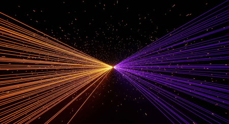 Dynamic illustration of colorful light beams converging in a starry space background.