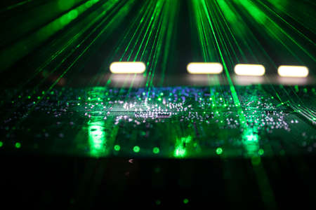 Texture laser show in the sky in the dark using a color spotlight during a concert close-up. High quality photo