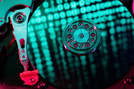 A hard disk with a blue binary code