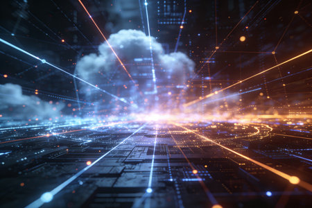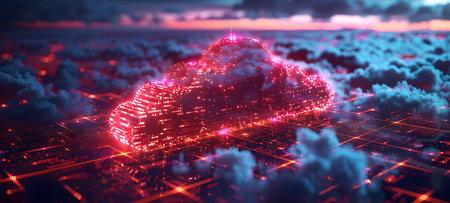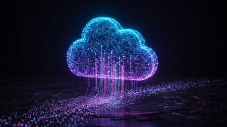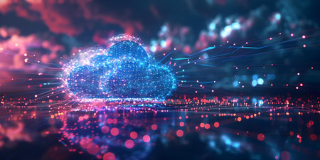 Futuristic Cloud Illustration with Glowing Particles, Networking Servers, and Data Flow