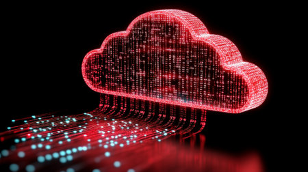Futuristic Binary Cloud Storage Concept with Red and Blue Visual Patterns Representing Data Flow