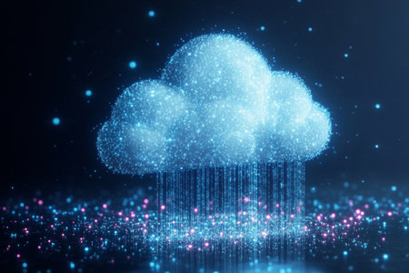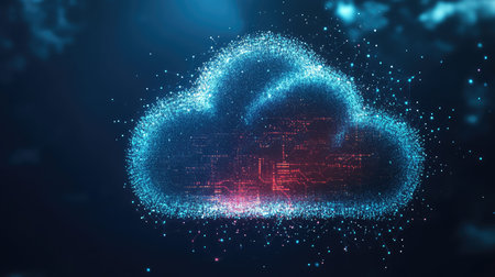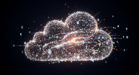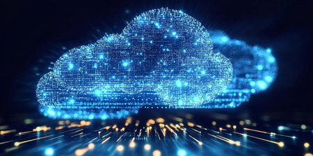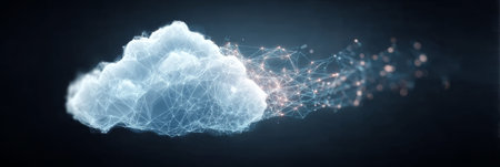 This stunning abstract image features a cloud rendered with digital connections, sparkles, and particles against a dark background, ideal for technology and innovation themes.