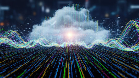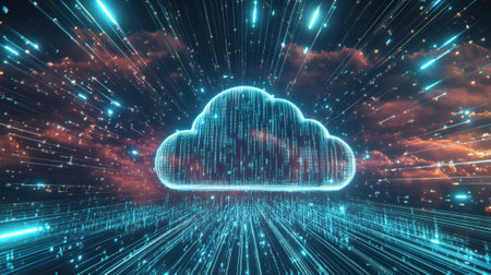 This image depicts an abstract representation of cloud computing. A luminous cloud is the central focus, accompanied by colorful data streams. The composition features a blend of light and dark elements. It could be used in presentations about technology, data storage, or illustrating complex systems. The scene conveys a futuristic and dynamic feel.