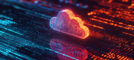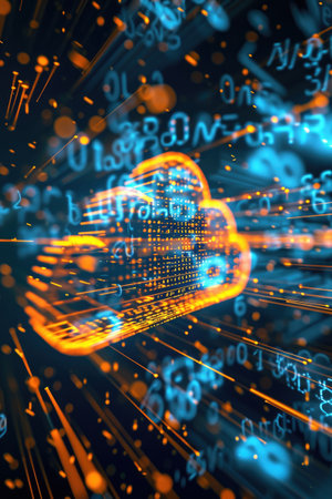 Abstract digital cloud with binary code and data flow, representing cloud computing and storage.