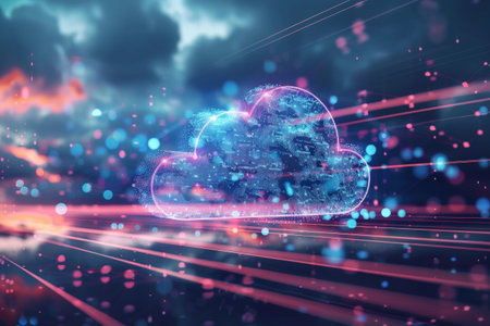 Abstract digital cloud with glowing lines and particles, representing cloud technology and data transfer, suitable for tech and innovation themes