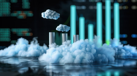 A modern computer screen displaying a colorful graph and a cloud concept represents data analysis, blending technology and innovation in a professional workspace.