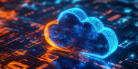 Abstract glowing orange cloud symbol over circuit board, representing cloud computing and digital data storage in a futuristic tech scene.