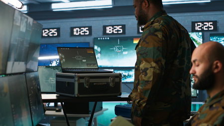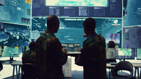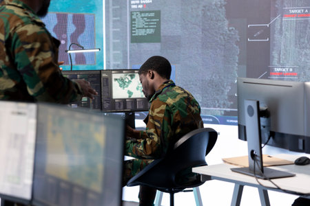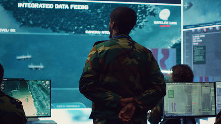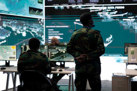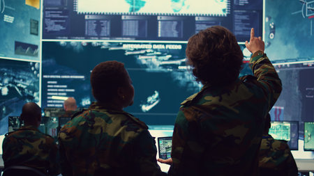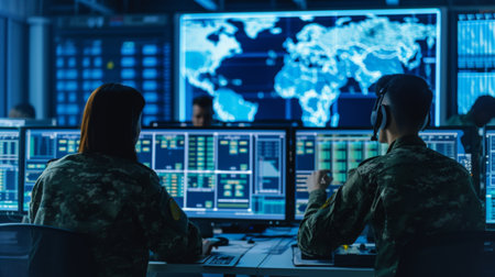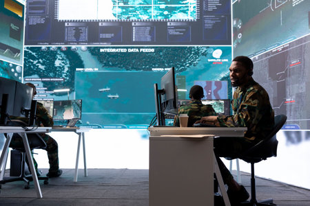Military specialists work in a high tech command post center, focusing on cybersecurity, surveillance and data protection to ensure the security and integrity of national information.