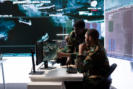 Military staff in a modern operations hub handling critical information collected on satellite systems, real time data helping support field missions. Army protocols vital for national security.