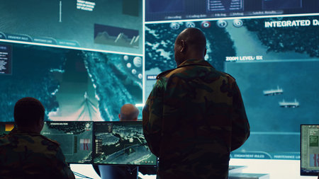 Military team in a command post base uses advanced technology, including satellite imagery and surveillance cctv systems. Support strategic planning and monitor potential threats, army operations.