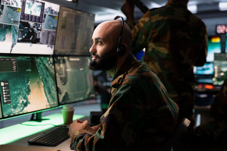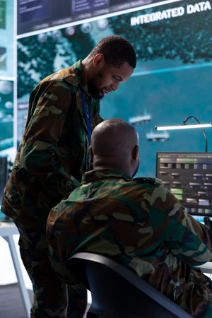 Military staff overseeing intelligence gathering activity to offer support to infantry unit in the field, ensuring national safety and defense. Trooper coordinating recruits team in control room.