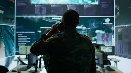 Military officer in a high tech control center engages in cybersecurity operations, protecting classified data from cyber threats and managing digital warfare strategies to maintain state secrets.