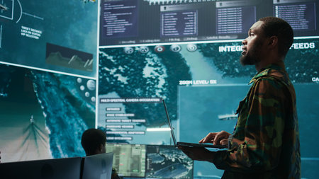 Soldier using warning system software on laptop in control room to monitor incoming enemy aerial attacks. African american army agent maintains air space superiority with radar during armed conflict