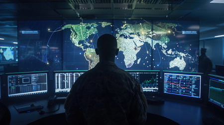 A military operations center with a soldier monitoring multiple digital displays showing world maps and data analytics, Technology and Army Communications