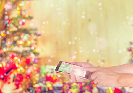 concept idea background image of hand using phone with ornaments in Christmas time .