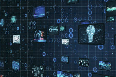 Multi exposure of desktop computer and technology theme hologram. Concept of software development.