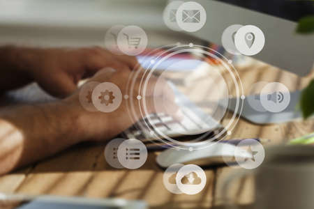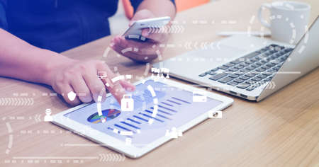 Business data analytics process management diagram.close up of designer hand working laptop with green plant foreground on wooden desk in office