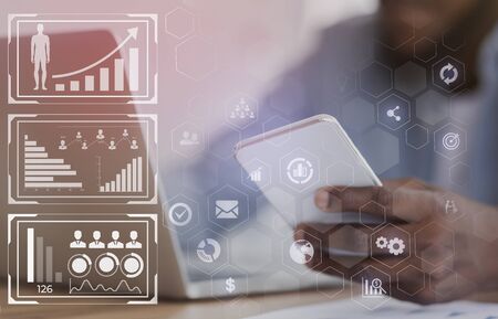 Human resources concept. Unrecognizable black HR manager using specific software on smartphone and laptop, collage
