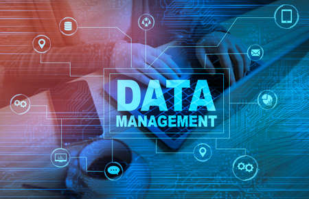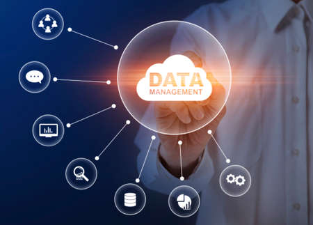 Man connecting storage cloud with data management inscription with different multimedia icons on virtual screen