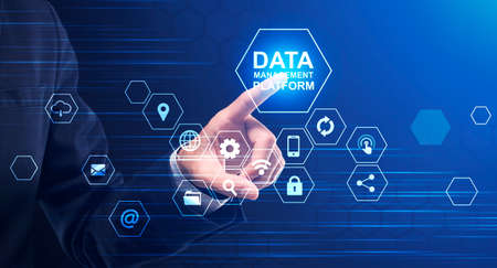 Data Management Platform. Creative Collage Of Businessman Pressing Button On Screen With Multimedia Icons