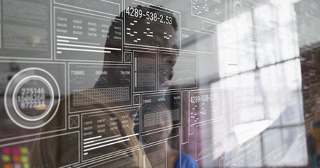 Image of data processing over biracial businessman working in office. Global business, finances, computing and data processing concept digitally generated image.