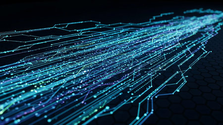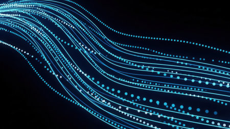 Dynamic abstract visualization of flowing blue light trails with glowing dots against a dark background, representing data or energy movement.