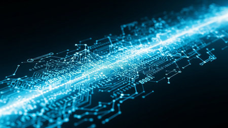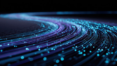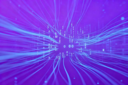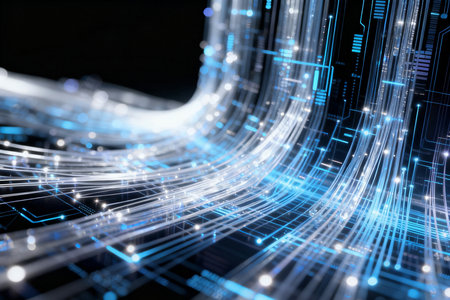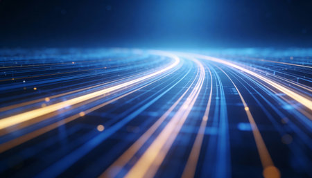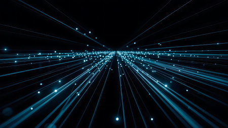 Abstract image showing bright blue data streams against a dark background. This dynamic composition represents advanced technology, network connections, and the rapid flow of information in the digital age.