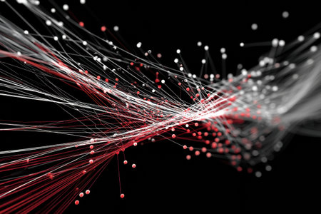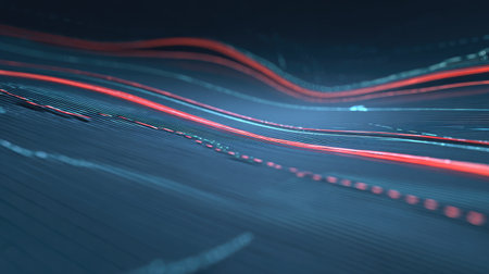An abstract digital illustration showcases a dynamic flow of light trails. The artwork features streaks of blue, red, and white against a black backdrop, suggesting high-speed data transfer. The composition has an immersive perspective. This imagery is suitable for technological and scientific projects.
