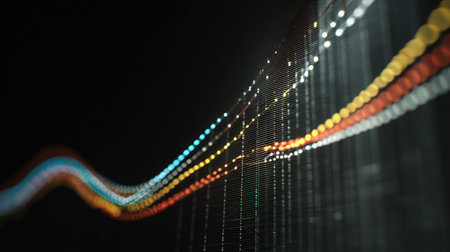 Abstract digital wave pattern with vibrant colors and light reflections creates dynamic visual effect. interplay of lines and colors evokes sense of movement and energy
