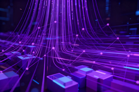 Abstract network of glowing blue and purple light trails and nodes on a dark background.