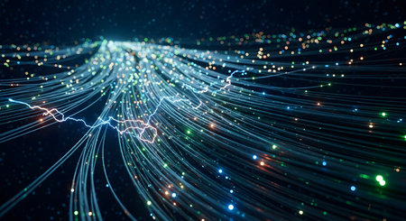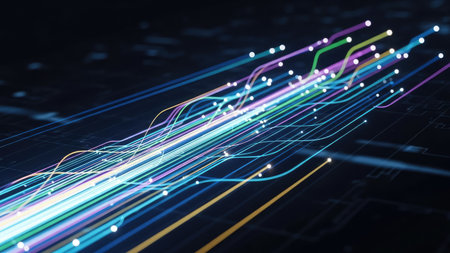 This image showcases a dynamic representation of data flow, visualized through vibrant, luminous lines. The artwork emphasizes the concept of connectivity and digital communication. Its style is modern and abstract, featuring a dark background that enhances the bright lines. This imagery could be used for various purposes, including tech-related presentations and marketing materials.