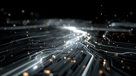 Futuristic abstract technology background with circuit board and glowing light trails. Concept for innovation and digital transformation.