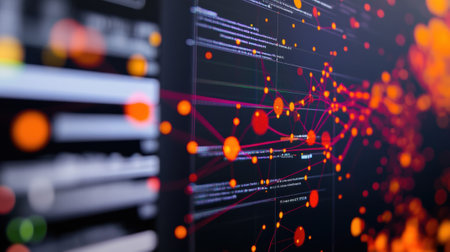 Colored abstract information networks, financial analytics big data, futuristic visualization, monitor screen in perspective