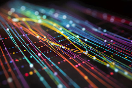 This image depicts a complex and vibrant digital network with numerous interconnected lines and nodes. The lines, glowing in various colors such as blue, green, purple, and yellow, represent data streams or connections. The nodes, which are smaller and scattered throughout the image, signify points of interaction or data exchange. The overall design suggests a high-tech, futuristic theme, emphasizing the intricacies and dynamism of modern digital communication and data processing.