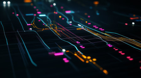 This image depicts an abstract digital data stream represented by colorful lines of light. The composition features a dynamic flow across a dark background. The scene suggests a high-tech environment with interconnected systems, appropriate for various commercial and editorial applications.