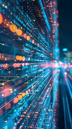 This dynamic digital cityscape at night showcases glowing data streams representing fast network traffic and code lines, symbolizing the speed and technological advances in big cities The background