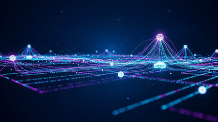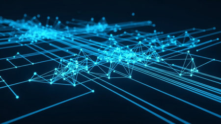 A digital network grid with glowing lines and nodes representing data transmission flow