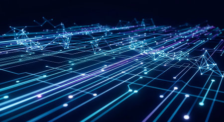 An intricate, glowing blue network of interconnected nodes and lines forms an abstract digital structure against a...